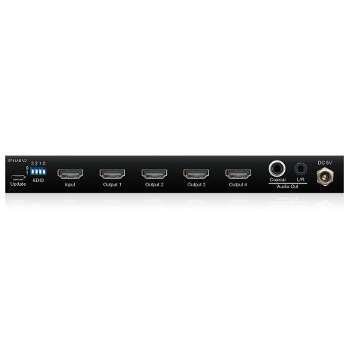 Our SP14AB-V2 4K HDMI 2.0 splitter distributes a single HDMI source to four simultaneous outputs. The splitter supports full HDMI 2.0 and HDCP 2.2 with video resolutions up to and including 4K @ 60Hz 4:4:4.